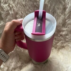 Stylish Stanley tumbler in bright pink. Comes with a convenient handle and straw lid.