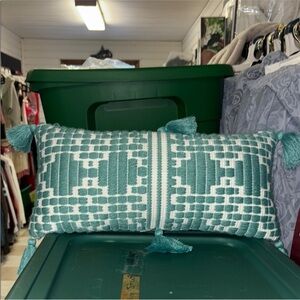 Add a touch of elegance to your home with this teal and white decorative pillow. Perfect for enhancing any living space. 10in x 20in