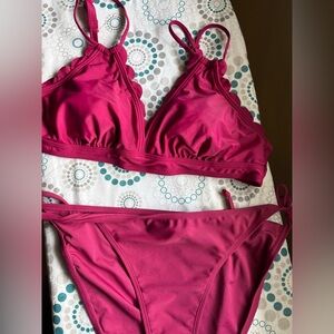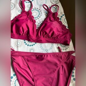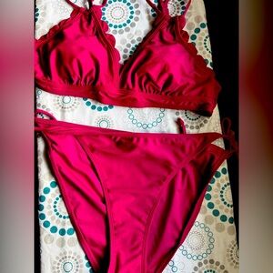 This is a gorgeous new women’s two-piece bikini size large runs big would fit an extra large top is a hall to removable padded. Push-up double straps in the back for extra comfort and security. Bottom is a basic string bikini full coverage gorgeous maroon red Color