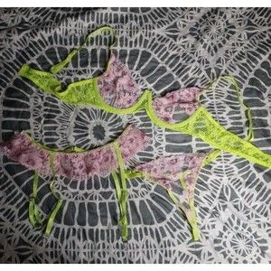 New lingerie 3-piece set lace pink and neon yellow size medium. No return will be accepted. F