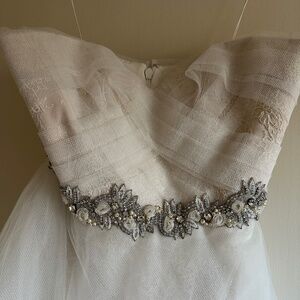 Tulle with hand stitched crystals, pearls and flowers to accentuate waist