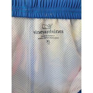 Product Details: New men's xl chappy swim trunks from vineyard vines. Multi color sailboat pattern. Tie front and inner netting. Side and rear pocket. Approx 16" in length and 6" inseam.