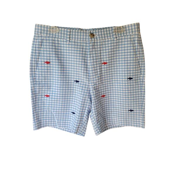 Product Details: New men's vineyard vines breaker shorts Size 32 in blue and white checker pattern with embroidered fish throughout. Side and rear pockets. Belt loop feature.