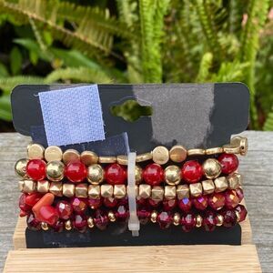 New nOir Jewelry Gold/Red Beaded Bracelet Set of 5 w/Feather Charm