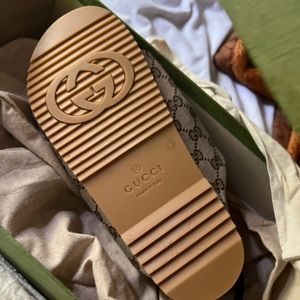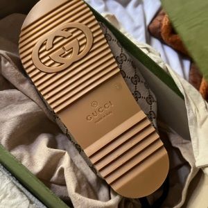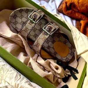 A pair of flat sandals crafted from monogram canvas in beige and ebony. First used in the 1970s, the GG logo was an evolution of the original Gucci rhombi design from the 1930s, and from then it's been an established symbol of Gucci's heritage.