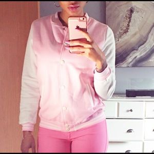Cute pink and white varsity bomber jacket! ⭐️Brand New ⭐️light weight ⭐️cotton blend⭐️runs small order 1 size up. I am wearing a large in the photo and I'm normally a medium