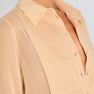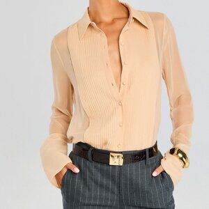 100% silk. Made in China. Dry clean only. Front button closure. Front pleated fabric. Buttoned cuffs. Garment is intentionally sheer, undergarments will show through.Please note undergarment not included. Our Style No. RTFF-WS139. Manufacturer Style No. FW24-10360.