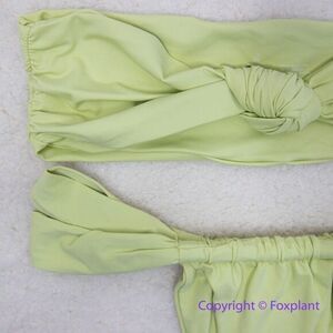 A snug fit made from 84% recycled poly and 16% spandex, it will feel like sweet butter on your skin, knot front bandeau top.