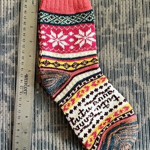 Vibrant knit socks with intricate patterns. Features red, green, blue, orange, and cream colors. Perfect for adding a pop of color to any outfit. Pack of 5 socks. Wool blend. Fits US shoe size 5-9. See pictures for details and measurements.