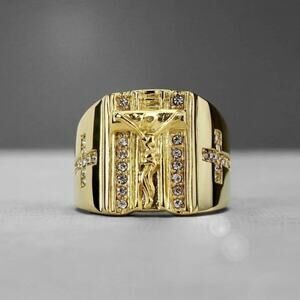 CZ Paved Cross Sides and Jesus on the Cross PVD Gold Over Stainless Steel Ring. Width 0.79" (20mm