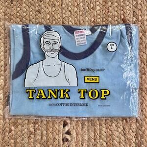 New, still in package vintage 70s men’s tank top. Light blue cotton tank top with dark blue ringer. Ego-Tex brand, made in Poland with a dapper mustached man on the packaging.
