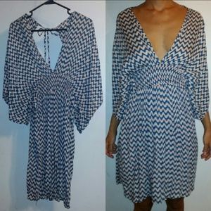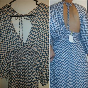 New with tag haiku short kimono dress in blue wave print by tiare hawaii. Size M/L very adjustable to fit many sizes with smocked waist. Modeled on a size 0-2 but would look better on someone with the curves to fill this beauty out! Blue & white waves with red spots. No trade please. The price is firm