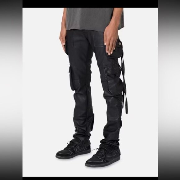 Sleek black leathered and waxed heavily black nwt rare mnml exact cut as amir! Tactical cargo pants with multiple pockets. Vegan leather string sties. Ideal for everyday wear. Flawless! Brand new ! 🆕