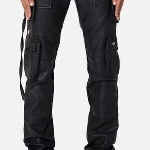 New, unworn men's black vegan leather tactical cargo pants in Amiri style, size