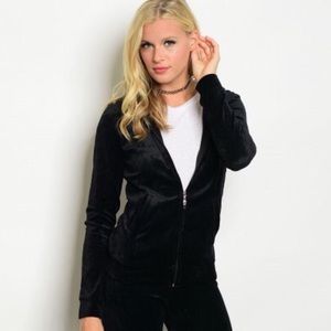 New velour jacket and pant track set in black. 65% polyester, 30% cotton, 5% spandex.