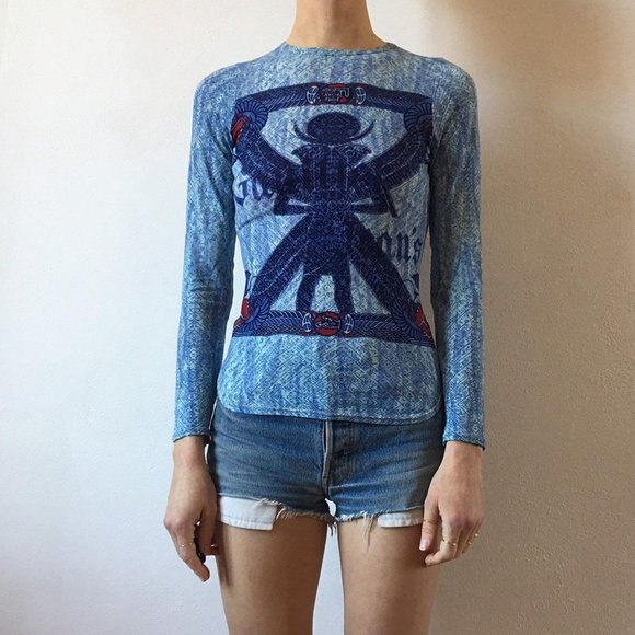 Brand new, never worn, no tags. Jean Paul Gaultier Egyptian hieroglyphs long sleeve 90s top. Very stretchy sheer tattoo style shirt. Long sleeve. Eye of Horus, Egyptian scarab beetle, hieroglyphics across background. Color is almost a blue tie dye effect with vibrant red details. Gaultier Jeans logo graphic across front, Gaultier Jeans label on back. Orange contrast stitching. Bella Hadid second-skin style. Very 1990s, 90s Y2K style. Size 42, fits XS-M depending on desired fit. Box PC.