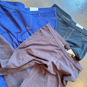 New w Tags 3 Pairs of HUE Soft & Skinny Leggings in Black (like a dark denim), Purple (it's called Emperor) and Brown (it's called Espresso). Each retails for $42.00.