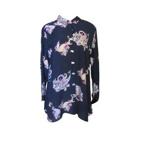 This sophisticated tunic by Multiples features a vibrant paisley pattern on a navy backdrop, ideal for both casual and formal settings. Its button-up front and relaxed fit ensure comfort and ease of wear. The lightweight fabric enhances breathability, making it a versatile addition to any wardrobe. The blouse is new with tags in size Large. Pretty buttons down the front. Please see the photos. 80 percent rayon and 20 percent nylon.