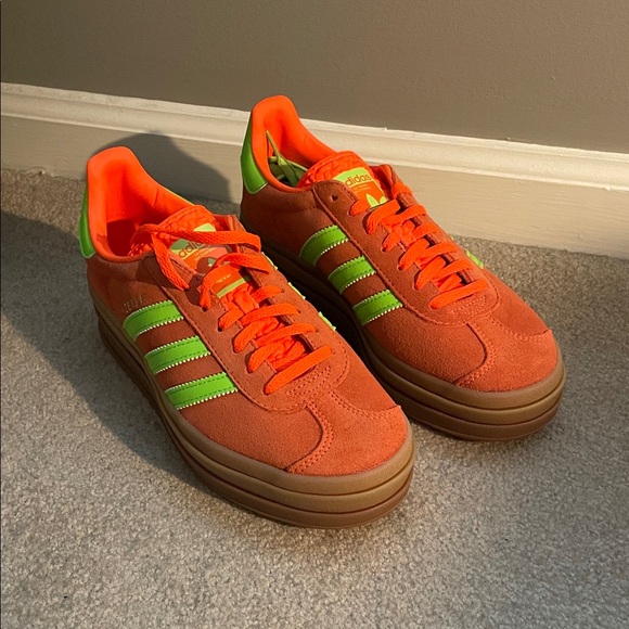 Platform Adidas Gazelle in bright orange with neon green accents.