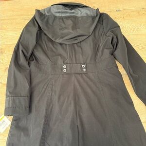 New with tags Relativity trench coat. Fully lined, detachable hood size M. This coat is jet black - many of the photos look gray.