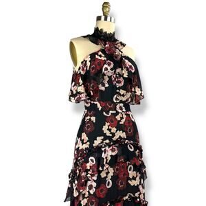New w/Tag NICHOLAS silk floral ruffle tiered asymmetrical Goddess gown. 100% pure silk fully lined in black poly. The details on this dress are incredible! Beautiful black silk with dark red and pink romantic roses. High mock neck with lace trim. Ruffles the flow down the sides. Fitted along the middle. Ruffle and tiered asymmetrical hem so its shorter at the front. Back hidden zipper closure. Designed in Australia. Marked size US 2 / UK 6 / ITALY 38 / FRANCE 34 /AUS 6. There is a tag still attached but has been cut. Originally $795.