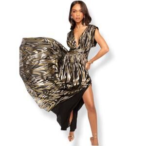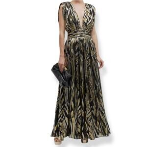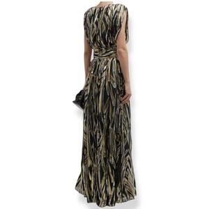 New w/Tags RAMY BROOK NEW YORK silk metallic Goddess gown dress. Brand new with tags attached! This gown is truly breathtaking in person and reminds me of a classic 1970's metallic gold Goddess gown. Black silk with gold and silver design. Deep V-neck at the front with capped sleeves. Open slit back with button closure at neck. Hidden zipper up the back. Ruched belted fabric along the middle. A-line flowing bottom with large slit up the left leg. 75% silk 25% metallic. Fully lined in black poly. Marked size 4. Originally $650.
