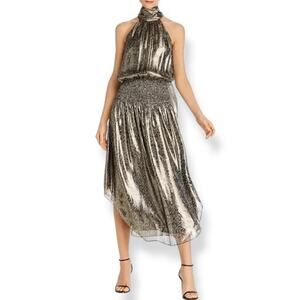 New w/Tags RAMY BROOK NEW YORK silk metallic snakeskin print evening dress. This gown is gorgeous in person! Super light weight silk with metallic gold and silver with a soft snakeskin pattern printed. It reminds me of the 1970's disco era dresses! High neck with large bow tie at the back. Cinched along the middle. Flowing bottom. Fully lined in black poly. 60% silk 40% metallic. Tag still attached but has been cut. Marked size small. Originally $795.