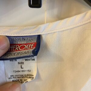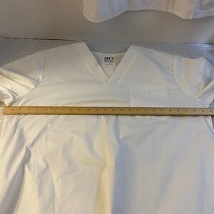 2 scrub tops. 1 new white UA. 1 white Cherokee top. Both are large. Measures 25” chest. 28.5” long. And 30” long.
