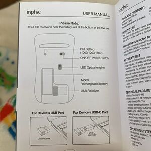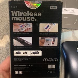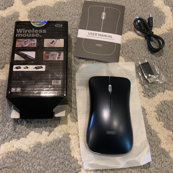 New in the box rechargeable wireless mouse. Comes with what’s shown