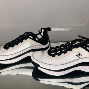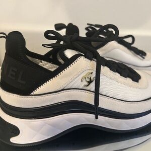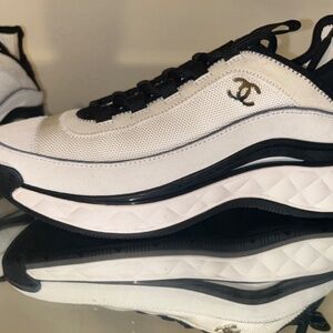 For ladies with style, who know…New, never worn Chanel Suede (mixed fabric) Trainers. Rare and hard to find beautiful white and black color with gold Chanel logo. Comes with two shoe bags and box.