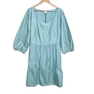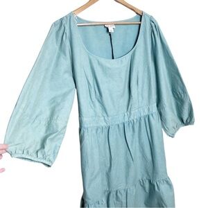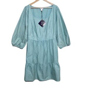 New with Tags Ava & Viv Women's Dress. Teal Sage Green Blue solid color. Fit and flare silhouette. 3/4 length sleeves. Ruffle skirt. Mini length. Tie back waistline. Feminine, Spring, Summer, Formal. Brand new condition with tags. Size X. Style: 021033785. 100% Cotton. Machine wash cold. Made in China.