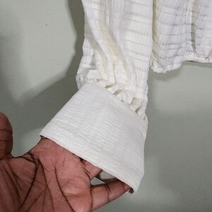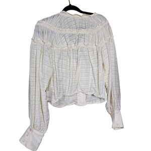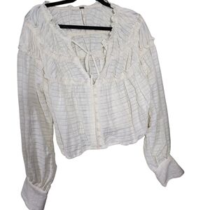 Beautiful top by Free People. The Hailey Blouse. Size is Large. Nice flowing cropped blouse. Color is ivory. Material is poly and elastane. Partial front loop button closure. Split neckline with tie closure. Ruffle detail throughout. Length about 22 inches. Pit to pit is about 22 inches across. Free People does tend to fit loosely and run larger in size. Condition is new with tags. Original price 128.00