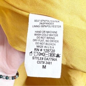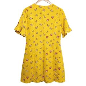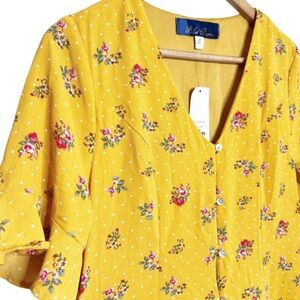 New with tags Women's Francesca's Blue Rain Mini Dress. Floral polka dot print. Yellow, Mustard base with White polka dots and Pink/ Green Floral print combo. V-neckline. Button down front. Fit and flare silhouette. Short sleeves with ruffle hemlines. Fully lined. Vintage, Floral, Preppy. New with tag condition. Size M. Style: DA7796A. Self: 97% Polyester, 3% Spandex. Lining: 100% Polyester. Hand or machine wash cold. Made in USA.