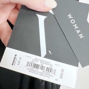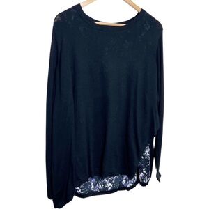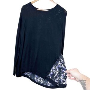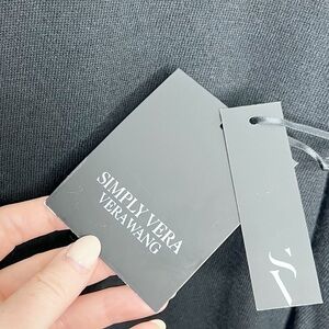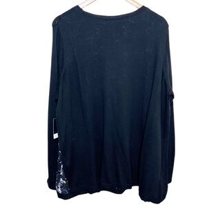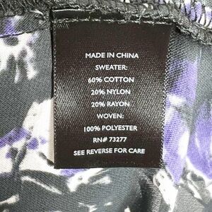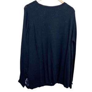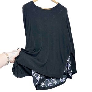 New with Tags Simply Vera Vera Wang Women's Blouse. Crew neckline. Long sleeves. Double layered top with left side cutout revealing mystical amethyst patterned tank. Full sleeveless lining. Long tunic style top. Soft knit sweater material in Pure Night Black color. Business casual, layered feature, feminine, formal. Brand new with tags condition, no flaws. Size 3X. Style: WV64S431PS. Sweater: 60% Cotton, 20% Nylon, 20% Rayon. Woven: 100% Polyester. Machine wash inside out with like colors. Made in China.