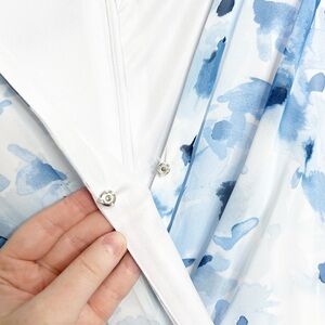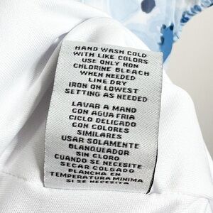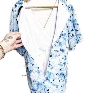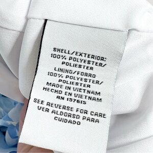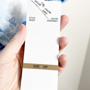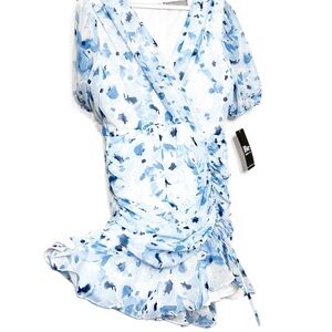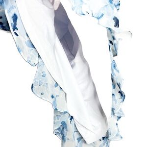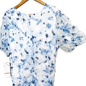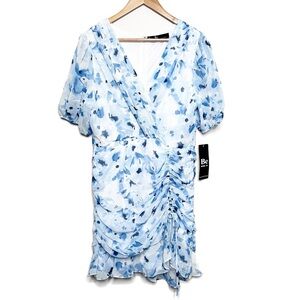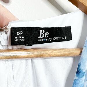 New with Tags Be by Chetta B Women's Mini Dress. Ivory, Navy, Blue color combo. Floral pattern throughout. Wrap style v-neckline at bodice. Clasp secure closure at chest. Puff Sleeves with stretch cuffs. Fitted skirt with ruching adjustable tie feature on side. Ruffle hemline. Mini Length. Fully lined. Back zipper closure with clasp. Formal, Party, Special Occasion, Wedding, Feminine, Ruffle, 90's, retro. Brand new with tags condition, no flaws. Size 12P. 100% Polyester. Style: 2B330J. Hand wash cold with like colors. Made in Vietnam.