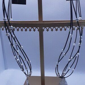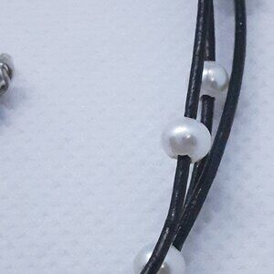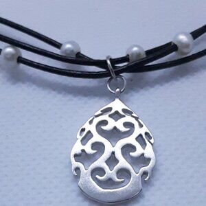 New boho style 17 inch three-strand rubber necklace with a 2-inch extender. The piece is laced with faux pearls and a filagree-cut sterling silver pendant and a 925 lobster claw clasp. Fits the neckline well. Original tags attached by Bamboo Trading Company. Two in stock. FREE SHIIPPING. OFFERS WELCOME!!