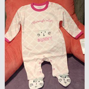 Very cute Kiddiezoom Mommy's Lil' Bunny Easter long-sleeve footie onesie, size 3 months. New with Tags. Bunny face in the center and two bunny faces on the feet with ears that stand up.