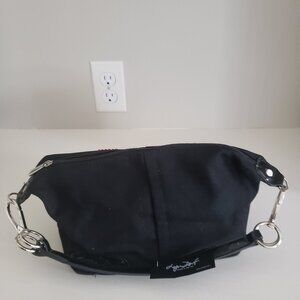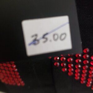 A Lyn Dorf ladies black canvas gag new with tags. Lyn Dorf is a company that specializes in rhinestone embellishments. There is a gorgeous letter N done in red rhinestones. It has silver hardware and a black patent handle. Inside is a green satin lining and a side compartment. This sells for $35 new. Bottom of purse is 9"x5 1/2" top is 14" across and 7" deep. Non smoking pet free home. @ BR #3