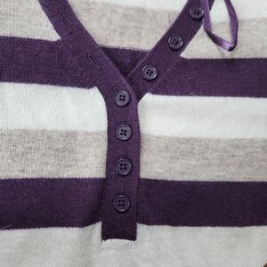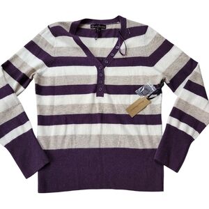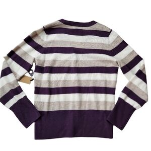 New with Tags Marisa Christina Angora Wool Blend Striped Fitted Sweater sz Large. Purple, tan white colors. Flat measurements approximately