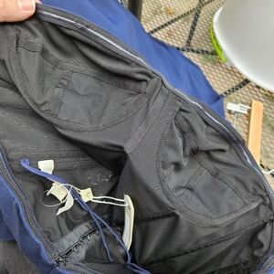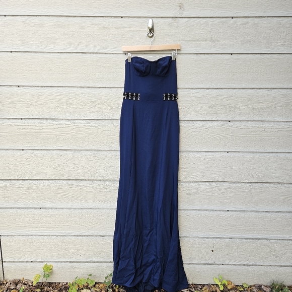 Floor length navy blue gown. Strapless, with bustier top. Sides of stomach have silver tone grommets and black accents. High slit on the side. Bustier has interior hook and eye closures for support, and the dress zips up the back. New with tags, but has a snag on the side, as shown in last photo. See photos for fabric and care details.