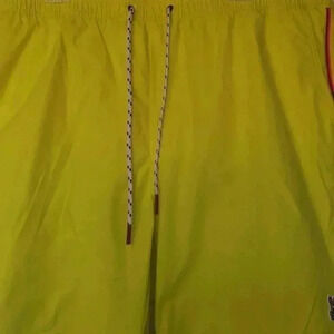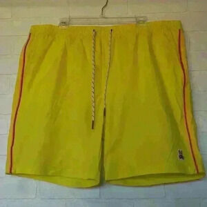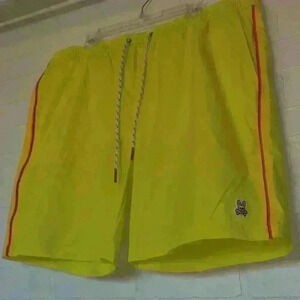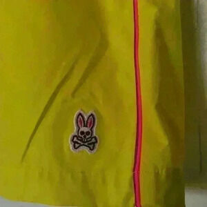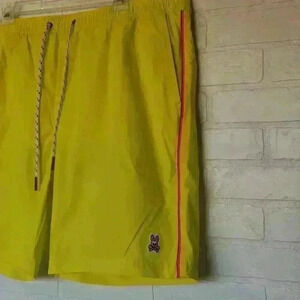 Psycho Bunny swim trunks. Material 100% Polyester. They have a mesh lining. Comes with the air tight zip lock plastic bag for wet swim trunk.