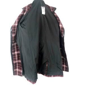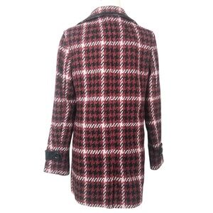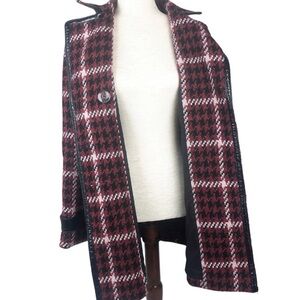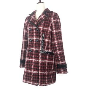 New with Tag Express Houndstooth Tweed Pea Coat. Red and black. Button up front. Double breasted. Faux leather detailing. Side Pockets. Extra buttons attached. Body: 62% Polyester, 28% Recycled Wool, 10% other fibers. Lining: 95% Polyester, 5% Spandex. Made in China. Dry clean only.