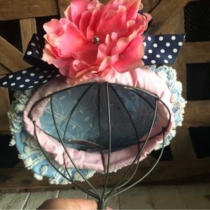 This is such a fun hat. Using vintage chenille bed spread. Antique button in the middle of the flower.