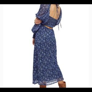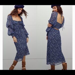New with tag Free People Aglow midi dress Size XS Blue Combo Square neckline Pullover drawstring detail in front with keyhole opening with tie in back Tiered puffed sleeves with smock cuffs Tiered detail at front waist, smocking and cutouts at back Material: Polyester
