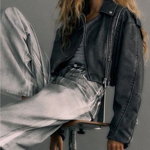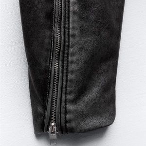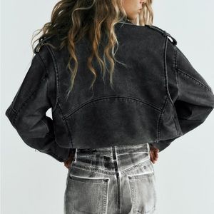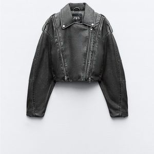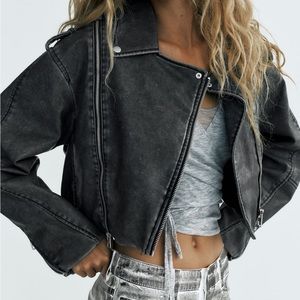 Distressed effect jacket with lapel collar and long sleeves. Front zipper detail and epaulettes. Front asymmetric zip closure.