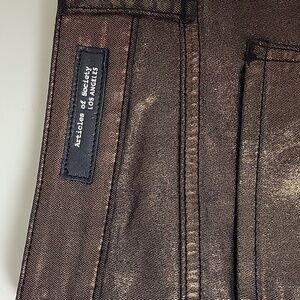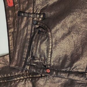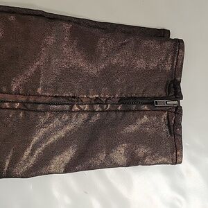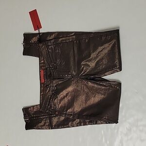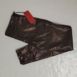 new with tags copper metallic waxed jeans sz 26. skinny zippers at ankles. 58% cotton, 49% polyester, 2% spandex. 9" rise, 39" inseam