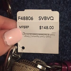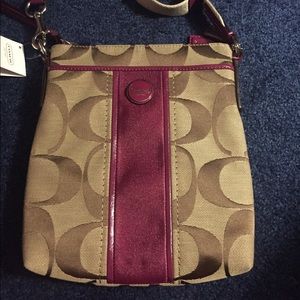 Tan bag with brown C's, passion berry stripe. Brand new with tags.
