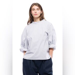 Elegant blouse with puff sleeves. Features subtle blue stripes. One size. Stunning, high quality material that screams designer. Selling in Nordstrom for $169 currently.