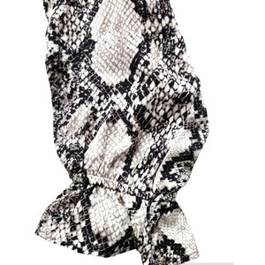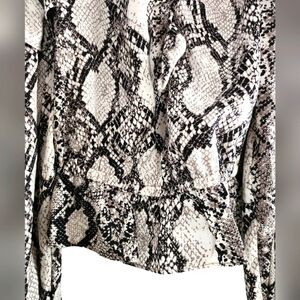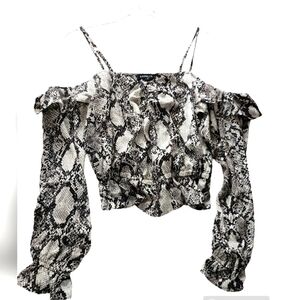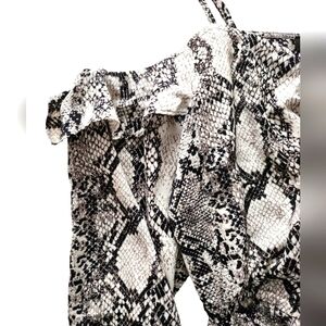 Express snakeskin print bow front, cold shoulder, peplum top, cinched waist and wrist, adjustable straps, Size Small new with tags.