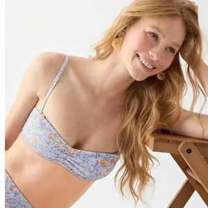 New with tags J crew Scrunchie sweetheart bikini top in afternoon floral cool breeze in size 2X. This swimsuit can be worn with one strap, two or strapless. This is a cute blue swimsuit with flower details.
